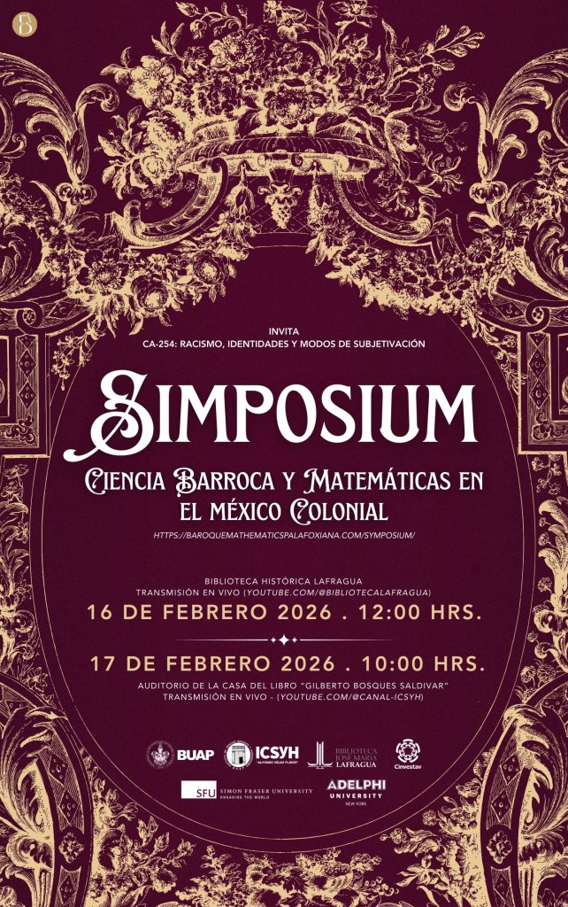 This Symposium is sponsored by Biblioteca Histórica José María Lafragua, the Social Sciences and Humanities Institute “Alfonso Vélez Pliego” (Benemérita Universidad Autónoma de Puebla), Simon Fraser University, the Social Sciences and Humanities Research Council of Canada, and Adelphi University. The event is an opportunity to bring together scholars interested in the complex history of baroque mathematics, science, and culture in colonial New Spain. The theme is focused on the tensions within 17th century science where speculative thought and occult ideas were mixed with careful observation and the centering of mathematical reason and instruments. Connections with other kinds of knowledges will be explored (theology, geography, and history), emphasizing the key role of texts and writing. This two-day event convenes in Puebla where baroque and creole cultural expression flourished, and where historical archives founded in the 17th century offer rich collections of books and manuscripts, including texts by scientists and polymaths such as Juan Caramuel, Gregoire de Saint-Vincent, Atanasio Kircher, Antonio de Alcala y Mendolia, Carlos de Sigüenza y Gongora, and many others. The symposium aims to build scholarly networks and interdisciplinary understanding of the nature of baroque thought in New Spain, shedding light on how mathematics and science were shaped in this important historical period and contested colonial context. We are pleased to announce that the presentations delivered at this symposium will be published in the official proceedings. Presenting authors are kindly invited to submit their full papers for inclusion in this forthcoming publication. Further details regarding the publication process will be announced subsequently.